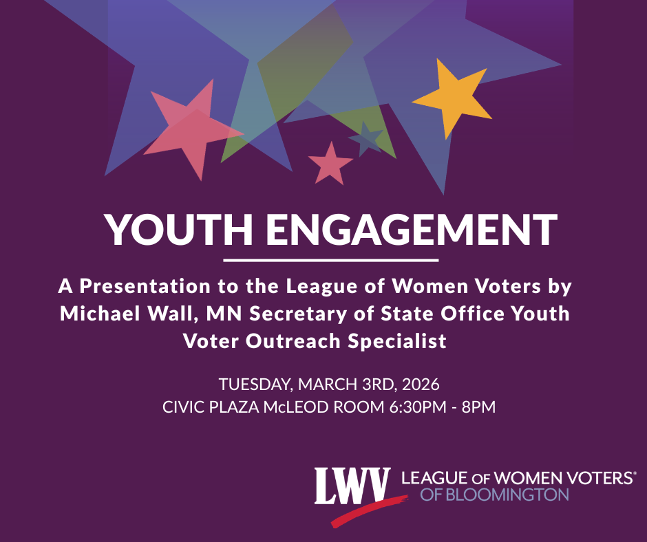 The Bloomington League of Women Voters hosts every election year a candidate forum with the local and state candidates for elected positions. In 2025, three Bloomington City Council and four Bloomington School Board seats are up for election. You can watch the candidate videos and the candidates forums, including the school board candidates, on our YouTube page.